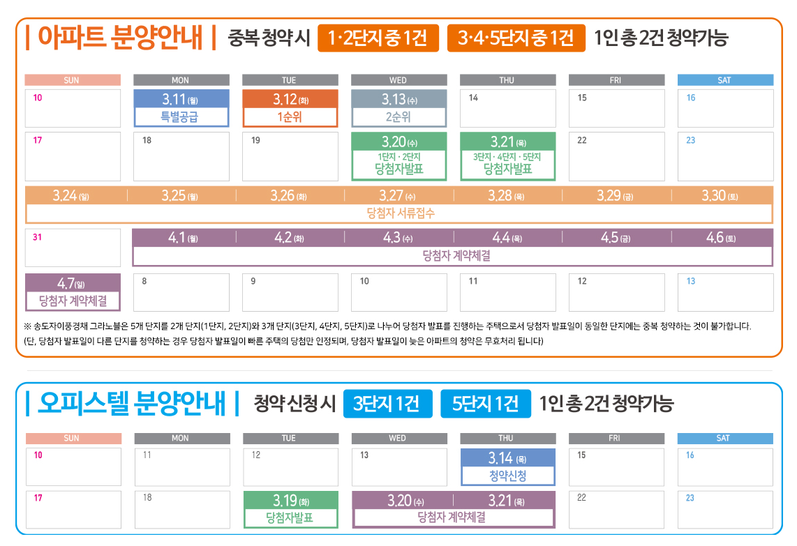 단지의 아파트 청약일정은 오는 11일 특별공급을 시작으로 12일 1순위, 13일 2순위 청약을 받습니다. 당첨자 발표는 1·2단지는 오는 20일, 3·4·5단지 21일이며 당첨자 정당계약은 다음달 1일부터 7일까지 진행될 예정입니다. 1·2단지와 3·4·5단지의 당첨자 발표일이 달라 중복 청약이 가능한 점 참고하세요. 다만, 당첨자 발표일이 빠른 단지에 먼저 당첨이 되면 당첨자 발표일이 늦은 단지의 청약은 자동 소멸됩니다. 1·2단지 입주는 2027년 6월이고, 3·4·5단지 입주는 2028년 4월 예정입니다.